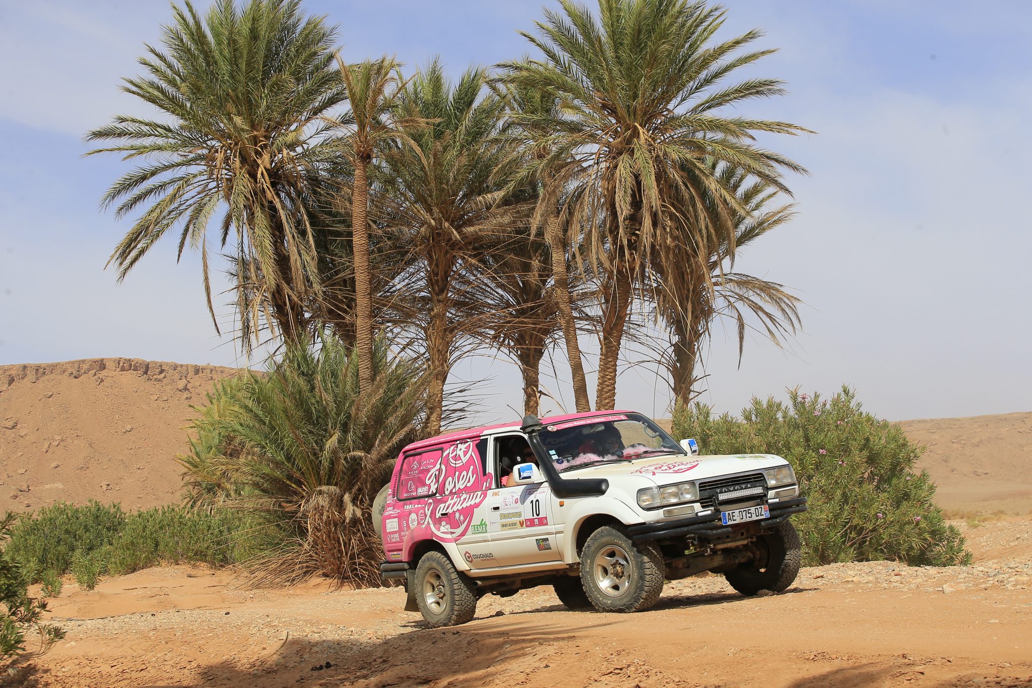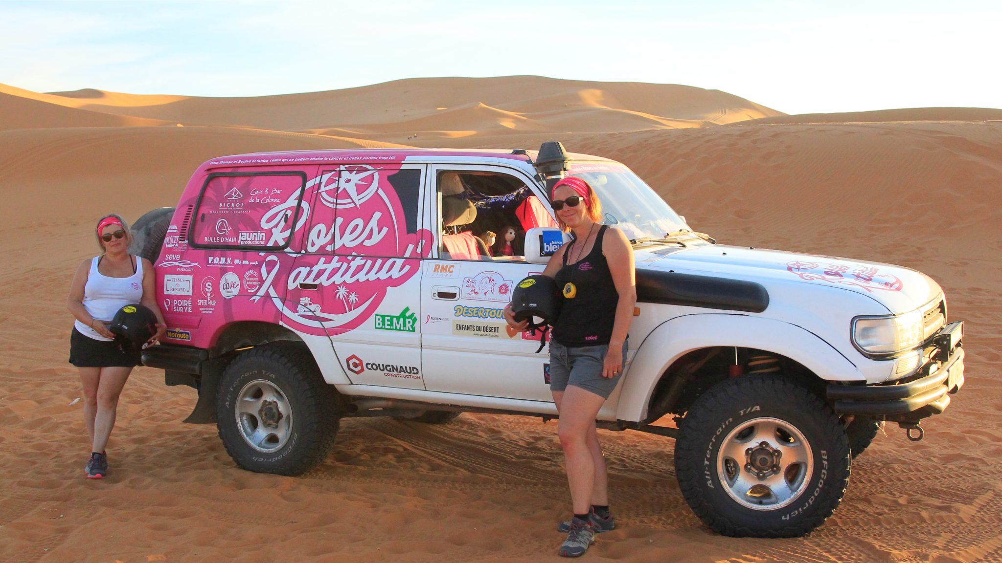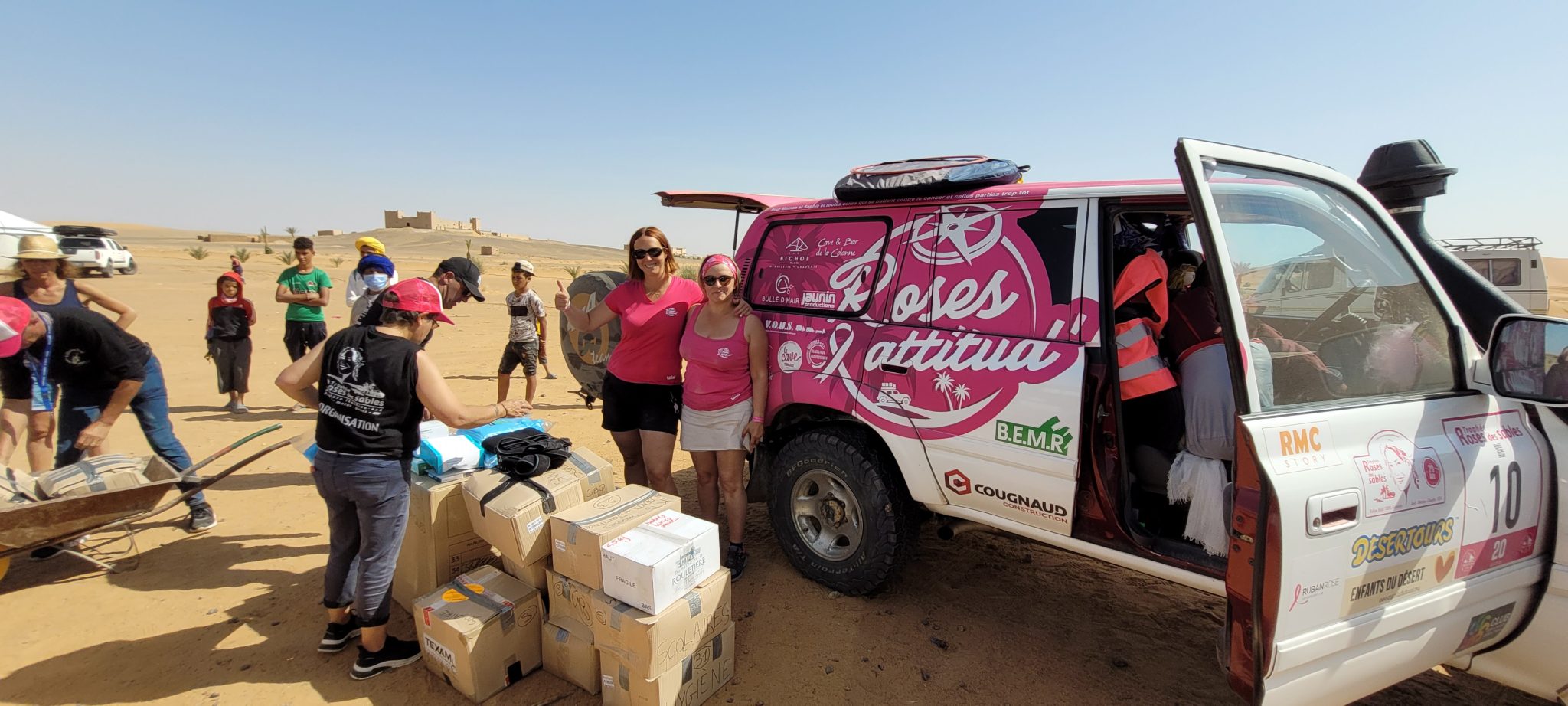 6eme étape. 148 kms – « Boucle Spéciale Begaa – seules sur Mars ». Pour commencer le jour « Spéciale Ruban Rose » nous avons effectué le symbole du ruban rose avec toutes les roses accompagnées de nos marraines Fanny Leeb et Pauline Deroulède dans l’immensité du désert marocain.
